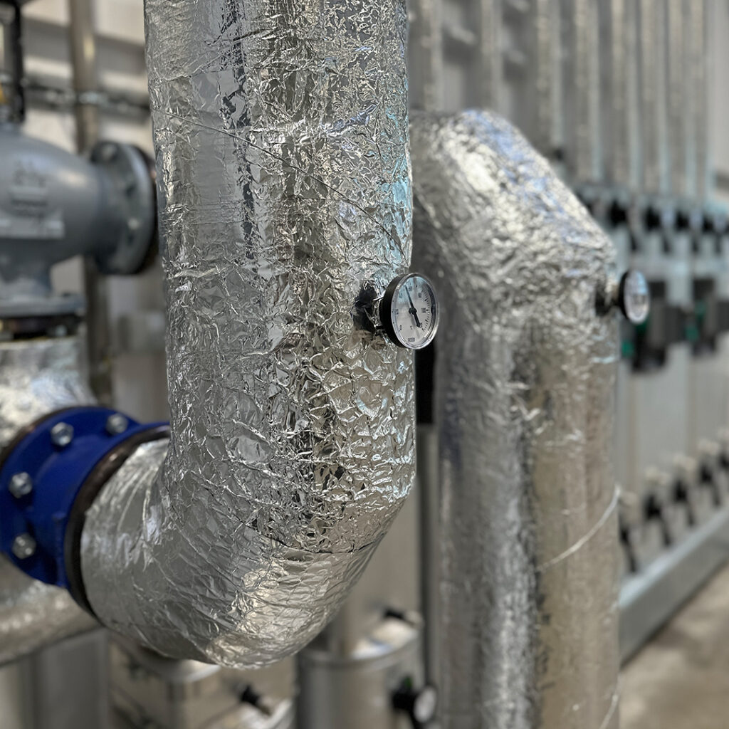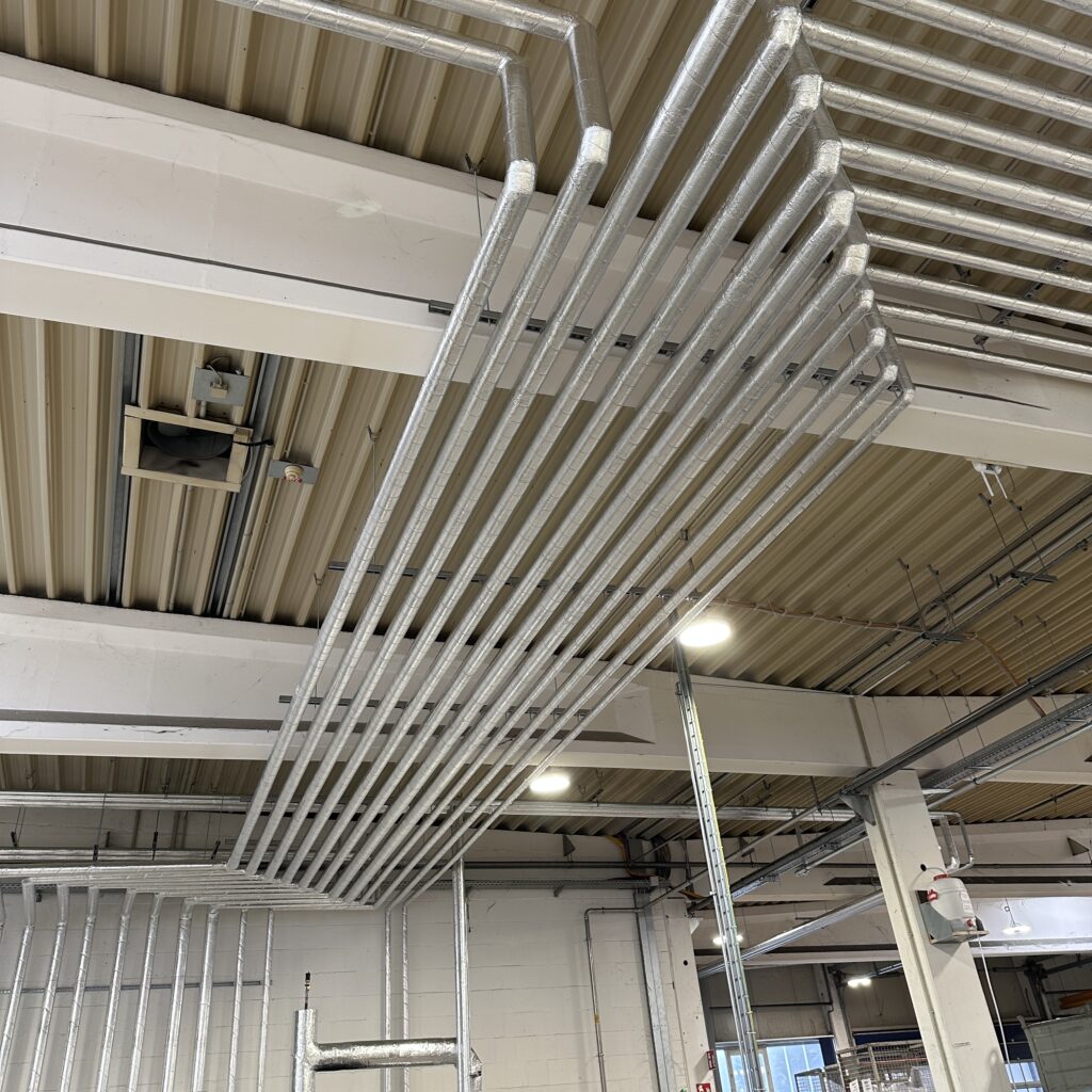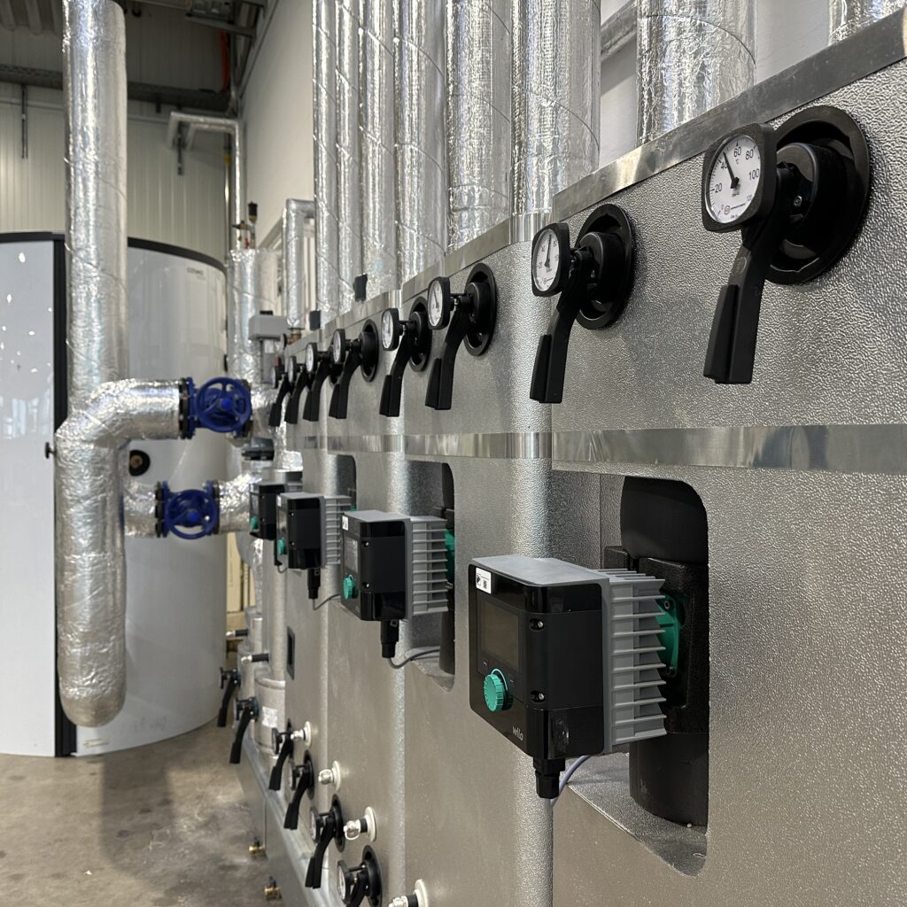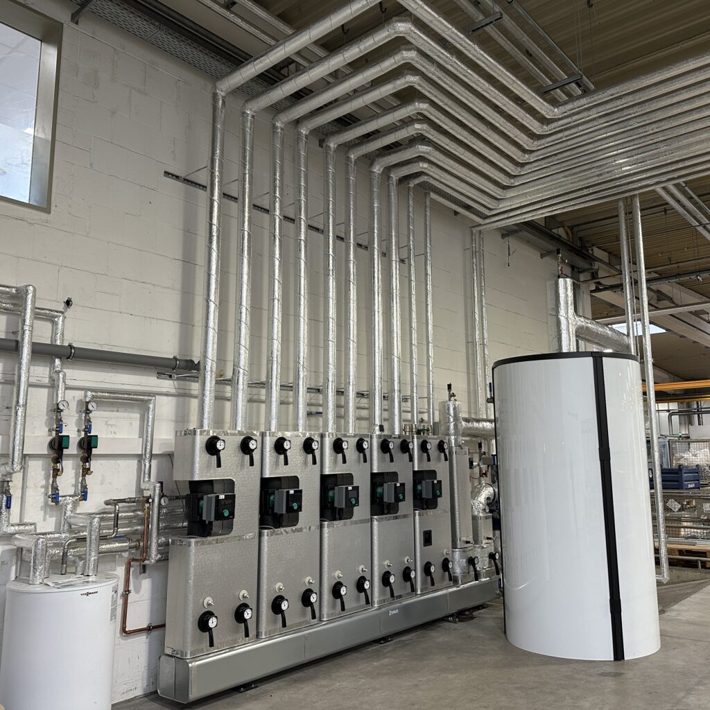 Diese eine von zwei neuen Wärmeverteilungen mit ca. zwei Kilometern neu verlegten Rohrleitungen und 34 neu installierten Lufterhitzern sorgt dafür, dass die erzeugte Wärme in die Produktionshallen und ins Bürogebäude von Lubing Maschinenfabrik GmbH & Co. KG befördert wird.